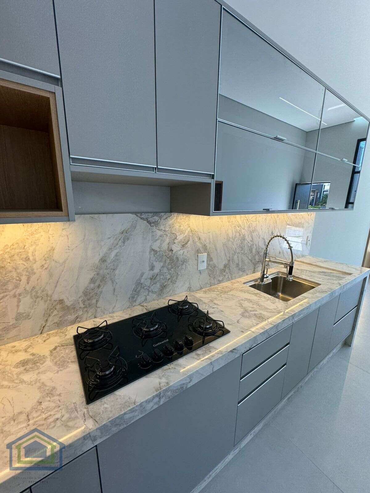 Cozinha com azulejo até o teto e planejada.